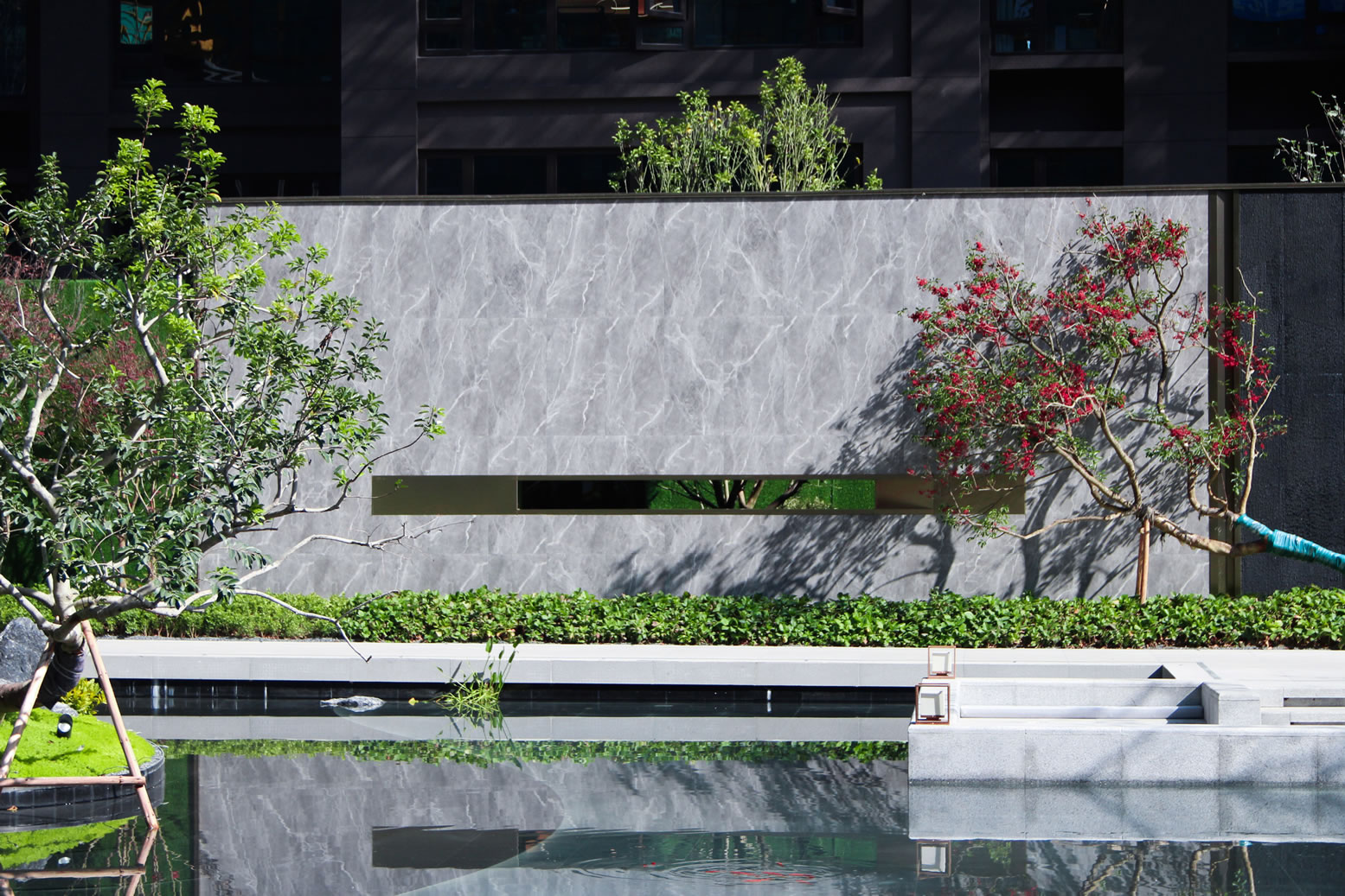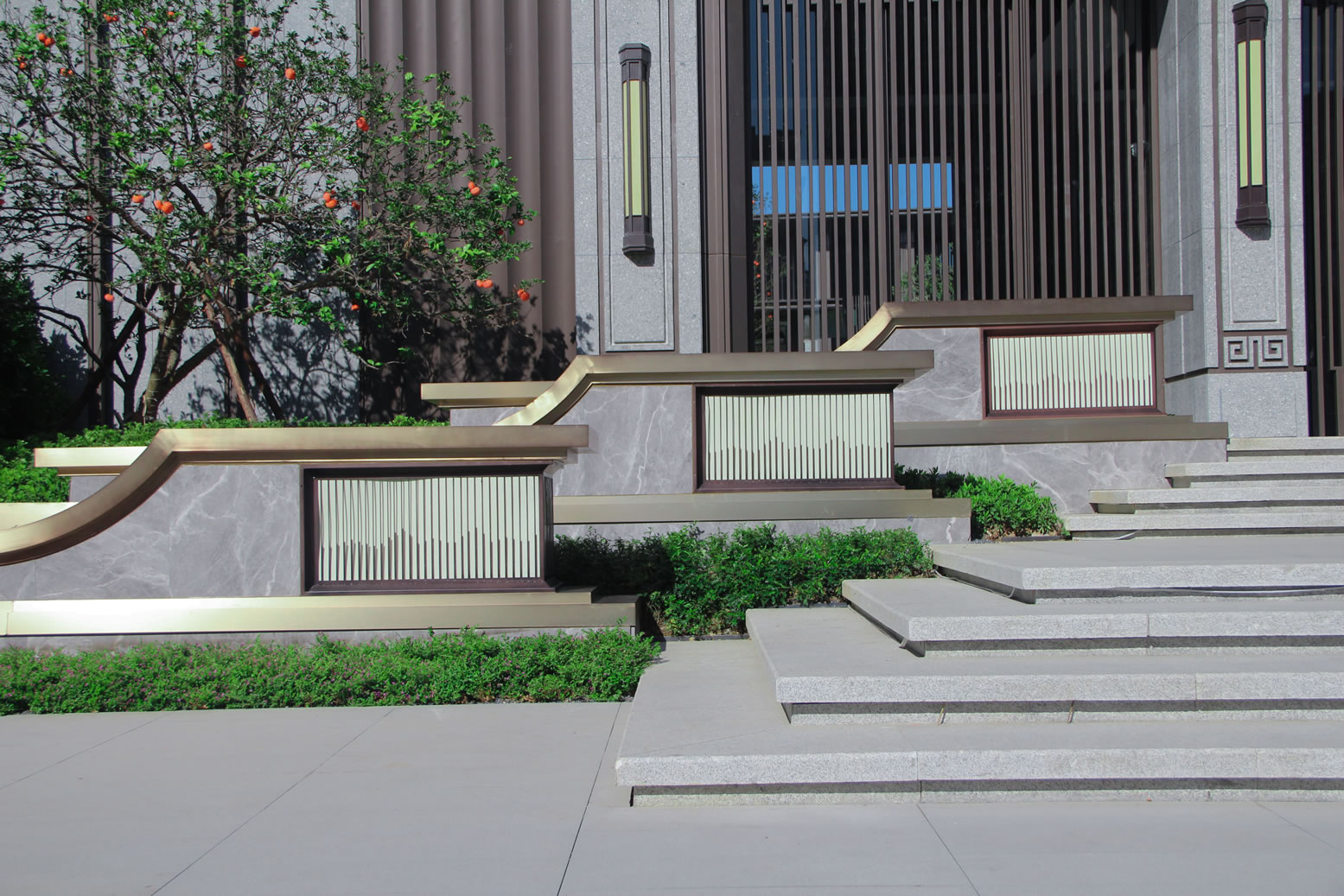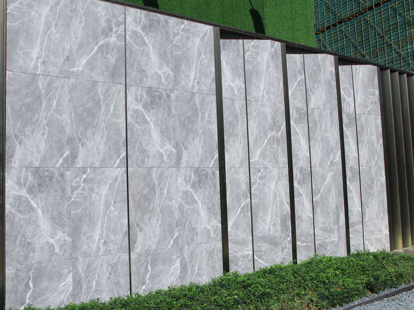 景墻使用600*1200希臘灰產品干掛鋪裝,